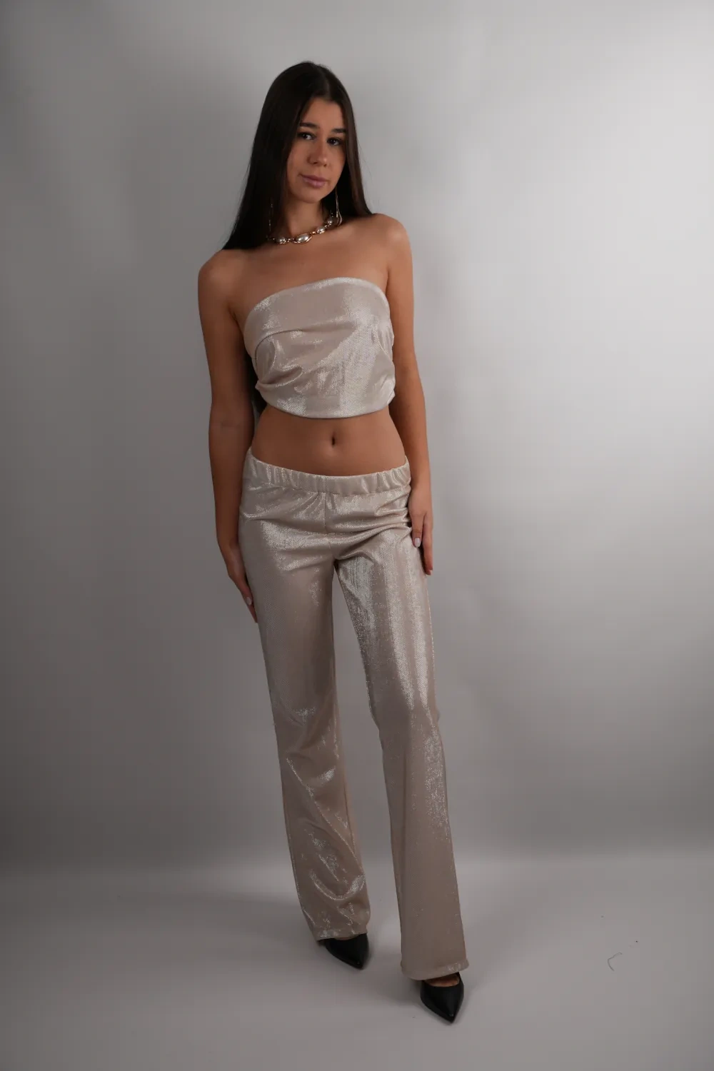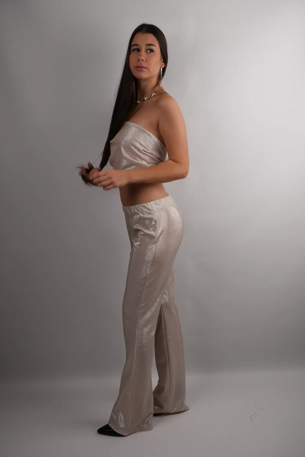 Komplet Lumina to synonim nowoczesnej elegancji i kobiecego blasku. Wykonany z delikatnej, elastycznej tkaniny o subtelnym, satynowym połysku w odcieniu ciepłego beżu, pięknie podkreśla sylwetkę i dodaje szyku każdej stylizacji.
