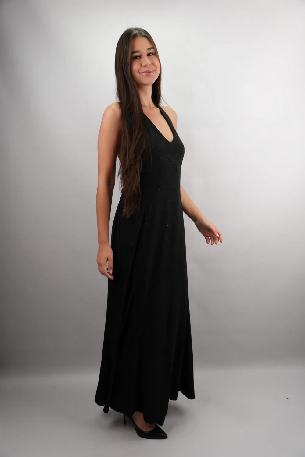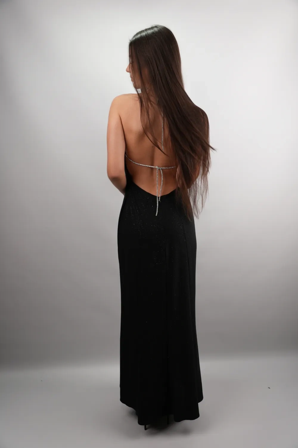 Delikatny połysk materiału nadaje całości szlachetnego charakteru, a głęboki dekolt typu halter pięknie eksponuje ramiona i szyję.